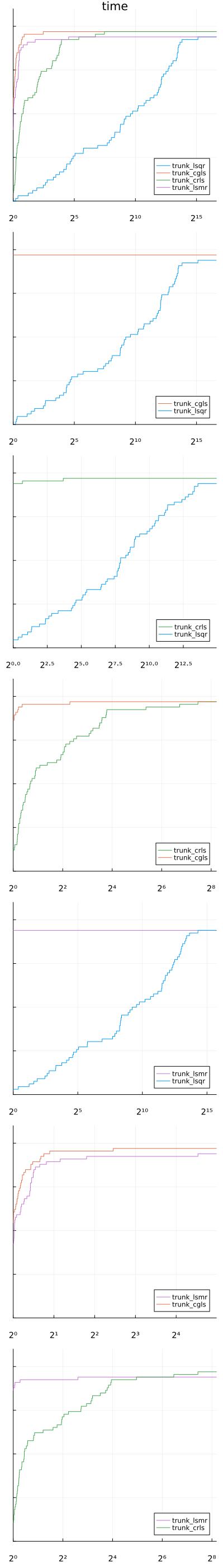 The CRLS and CGLS variants are the ones solving more problems, and even though the difference is rather small the CGLS variant is consistently faster which seems to indicate that it is the most appropriate subsolver for TRUNK. The size of the problems were rather small here, so this should be confirmed on larger instance. Moreover, the results may vary depending on the origin of the test problems.