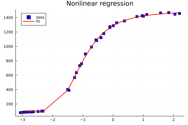 plot!(x, t -> m(stats.solution, t), c=:red, lw=2, lab="fit")
